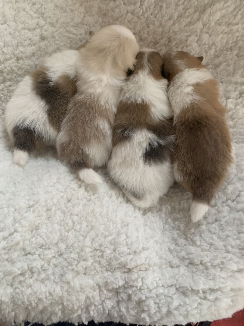 My beautiful girl delivered five healty puppies both mum and puppies are doing great mum as the most wonderful nature and dad is a handsome boy both parents have amazing coats all the puppies are parti colour puppies will leave with first vaccination and micro chip and second vaccination is included mum can be viewed with puppies a small none refundable deposit required when Puppy has been chosen I really would prefer to meet in person but I do live video calls