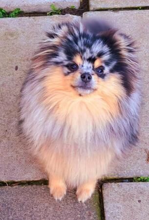 Midas is a 1 year old male pomeranian.He is kc registered, Russian Grandparents and carries Lilac. He is micrcohipped. Vaccinated, Wormed and flead to date. He is house trained. Great on lead. Travels fine in the car. Good at the groomers. Very good with children and other dogs. Blue merle with tan pomeranian.